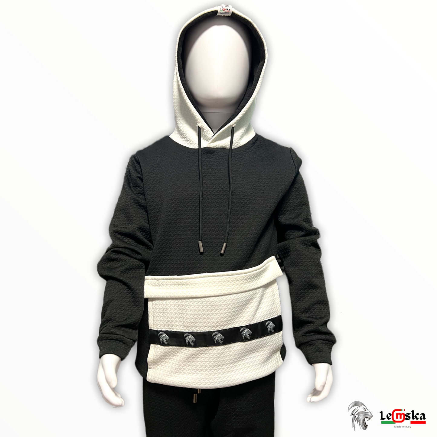 TUTA COMPLETA BIMBO PRIMAVERILE EFFETTO "NIDO D'API", felpa con cappuccio e tasca centrale a contrasto con banda leone e pantalone con tasche laterali. Elastico alla vita e alle caviglie per una vestibilità comoda e alla moda. Tuta unica e particolare.